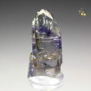 Tanzanite is a gem form of zoisite, found only in the Arusha region of Tanzania. Mining is very deep, as gemstones easily go for $250 - $1000+ per carat. Crystals are also produced, of varying quality given largely that anything with a gemmy area within it gets cut. Also most are dinged, so getting pristine specimens is very difficult. Most pieces are heat treated, which mimics the natural geology that gives the crystals that amazing blue-purple color. The mines are incredibly deep and long term future production is in question.It weighs 21.37 carats (4.27 grams). It is a vibrant blue-purple with remarkable gemminess through out. The termination is pristine. The side near the bottom has a slight sheered spot that under the microscope is a crystallied face, so this happened while in the pocket and still growing.(it's very hard to spot) The main front face has some raised triangles (known as screw distortions to geologists), overall a great crystal, with flashes of purple when looking at it from the side.