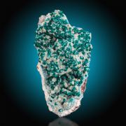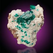 Clusters of sharp lustrous Dioptase crystals on white Calcite crystals. The Dioptase crystals reach 1.4cm in size and occur in two main clusters with several smaller crystals spinkled across the Calcite. Some very minor contact on the left cluster of Dioptase crystals, otherwise perfect and undamaged. Data last checked on 24th Oct 2025 - specimen may no longer be available