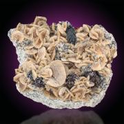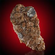 This is a small cabinet-sized specimen with tombac-colored, partially black patinated, distorted crystals of the rare Copper-Antimony sulfide Famatinite. They are associated with small, sparkling brass-colored Pyrite crystals. Famatinite is usually one of the mineral species that is relatively difficult to find. On one hand because it is relatively difficult to detect and often mistaken for better-known members of the Stannite group, and on the other hand because it often occurs massive and quite rarely in idiomorphic tetragonal crystals. In this case however, we have a specimen with large crystal aggregates about one cm in size. Furthermore, the species of this piece has been confirmed by an analysis. The specimen with the rare and excellent Famatinite was formerly housed in the Dr. Manfred Schönfelder collection.Data last checked on 22nd Oct 2025 - specimen may no longer be available