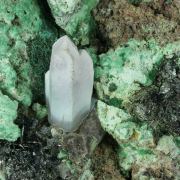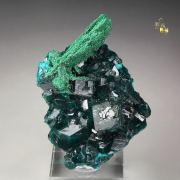 A neat combination specimen with a spray of attractive green malachite crystals 2.7 cm nine, this on a thin breccia matrix with green crystals of dioptase measuring to 1.5 cm. Colorless gemmy quartz is present as well. In excellent condition.From: Weinrich Minerals