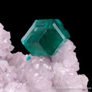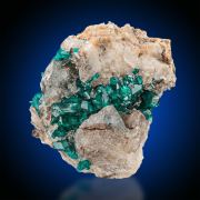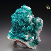 Another beautiful and desired Tsumeb combination piece, featuring numerous multifaced and sharp Dioptase crystals to 6 mm, nicely scattered over sharp and colourless-white Calcite rhombs measuring 1,2 cm in diameter. Both species are highly lustrous and gemmy with a wonderful contrast and aesthetic impact. Definitely one of the most coveted Tsumeb classics is this amazing colour combination with an absolutely pristine display face.Data last checked on 28th Oct 2025 - specimen may no longer be available