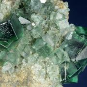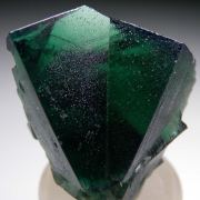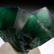 Lustrous, transparent, gemmy, pale-green, penetration-twinned Fluorite cubes to 22 mm, perched on a larger, partial Fluorite crystal. The Fluorite has sharp zoning with darker green edges. These Fluorites are strongly fluorescent. The quality is excellent, and except for being incomplete on the reverse, the display side is damage free. ex. Tim Sherburn specimen.ex. Carolyn Seitz collection