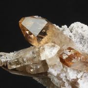 Over a dozen light-sherry-colored, gemmy Topaz crystals with glassy luster and perfect, sharp terminations, are nestled aesthetically in a rhyolite matrix vug. The largest Topaz measures 16 x 6 mm, and a very gemmy 8 x 6 Topaz rises prominently from the pocket. This is an very nice specimen, collected by Chris Lehmann in the fall of 1991.Data last checked on 28th Oct 2025 - specimen may no longer be available
