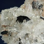Highly-lustrous, clear to translucent bipyramidal Quartz crystals to 20 mm are perched on a thin crust of Quartz matrix. Many shiny black Hematite crystals are sprinkled on and within some of the Quartz. There seem to be more than one generation of Quartz, and also some Quartz phantoms. In excellent condition, it is nicer in person than the photos. Purchased by Carolyn from Ray Grant in 1999, it is a great example of these classic Quartz from this famous Russian locale.ex. Carolyn Seitz collection