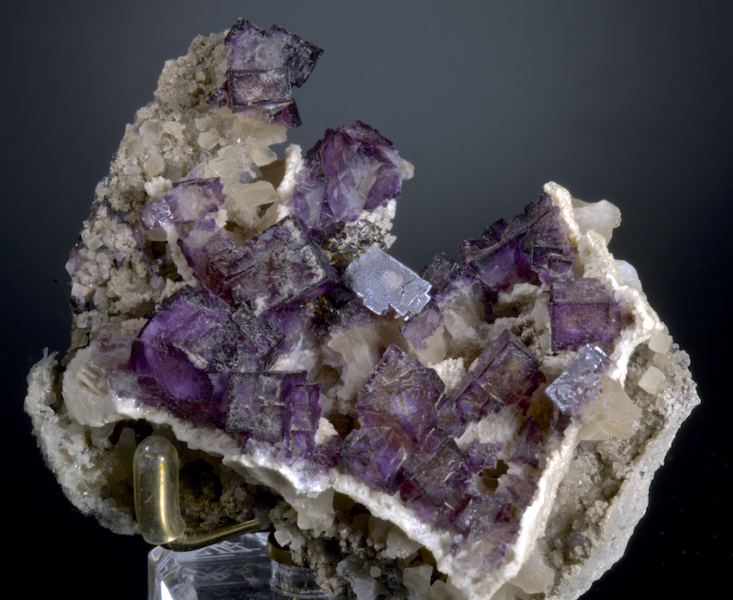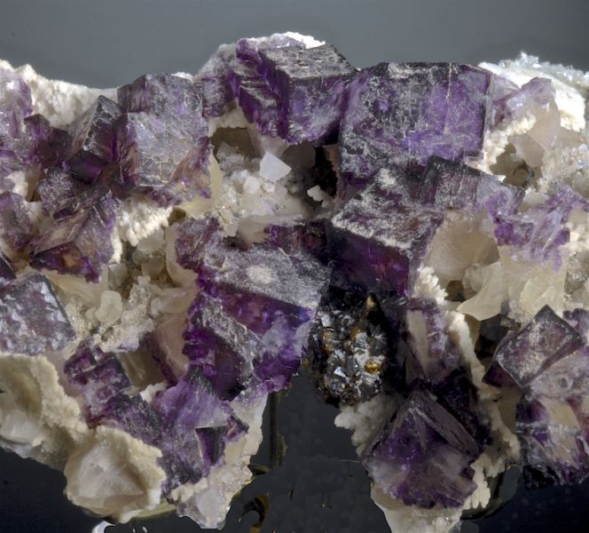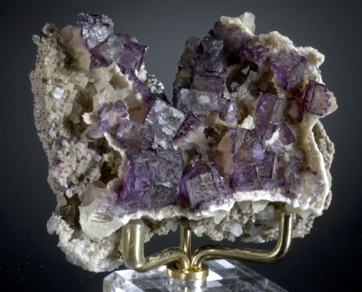 An excellent grape purple cluster of well-formed translucent cubes with some minor zoning. The form is unusual and delicate with very sharp cubes perched on thin crusts of Calcite in a vug-like structure. From the famed Rosiclaire zone of the Minerva #1 Mine, this is from a unique find more than 35 years ago. Displays very well from several angles and in very good condition overall. A few very tiny cleaves are present so not technically perfect but most crystals are indeed fully perfect, The cleaves are not easy to spot by naked eye, this is as fine as anything we have ever seen from this unusual find. From: Well-Arranged Molecules