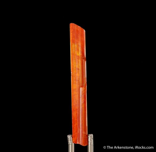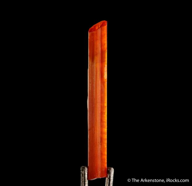 This is a Crocoite from Adelaide Mine, Dundas, Zeehan Dist., West Coast Mun., Tasmania, Australia. Crocoite from the modern finds in Tasmania are gorgeous but they tend to form as beautiful crystal clusters of slender, moderately-lustrous radiating sprays, while older material such as this piece from the 1980s or previously, had some exceptional, elongated, translucent crystals with metallic luster, as you see here.Data last checked on 28th Jan 2026 - specimen may no longer be available