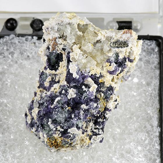 Colorless crystals of topaz across this matrix with purple crystallized fluorite. Minor molybdenite present as well. Collected in 1996. The topaz fluoresces yellow in color, of fluorite a vivid bluish color. TheFrom: Weinrich Minerals