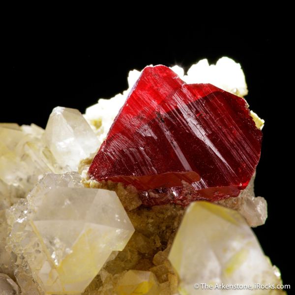 This is a Cinnabar on Quartz from Tongren Mine, Bijiang Dist., Tongren, Guizhou, China. A classic combination specimen from Tongren, China featuring a large, crimson-red Cinnabar crystal associated with numerous, glassy Quartz crystals.Data last checked on 27th Feb 2026