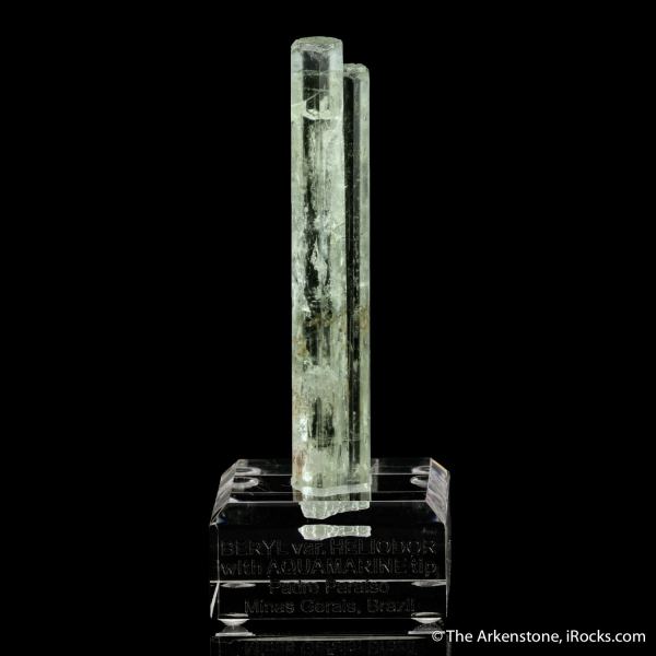 This is a Beryl var. Heliodor with Aquamarine tip from Padre Paraíso, Minas Gerais, Brazil. A lustrous, internally sparkling, gemmy Heliodor crystal duo from the specimen prolific Padre Paraiso area of Brazil.Data last checked on 28th Jan 2026