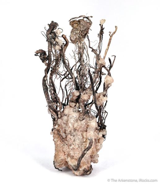 This is a Silver with Calcite, on Calcite from Linqu Co., Weifang, Shandong, China. An elegant cluster of thin, gracile silver wires perched flaring up from the matrix with a surface of small mounded calcite crystals.Data last checked on 28th Jan 2026 - specimen may no longer be available