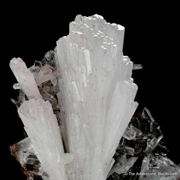 This is a Hemimorphite from Potosí Mine, West Camp, Santa Eulalia Mining Dist., Aquiles Serdán Mun., Chihuahua, Mexico. A beautiful cluster of lustrous and translucent, pure white crystals of hemimorphite, to 6.5 cm in length, is highlighted against a background of brownish red matrix.Data last checked on 28th Jan 2026 - specimen may no longer be available