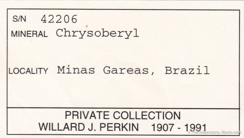 This is a Chrysoberyl from Colatina, Espírito Santo, Brazil. These historic chrysoberyl specimens were collected in the 1940s-1950s and remain true mineral classics of the Golden Era of Brazilian gem crystals.Data last checked on 23rd Feb 2026