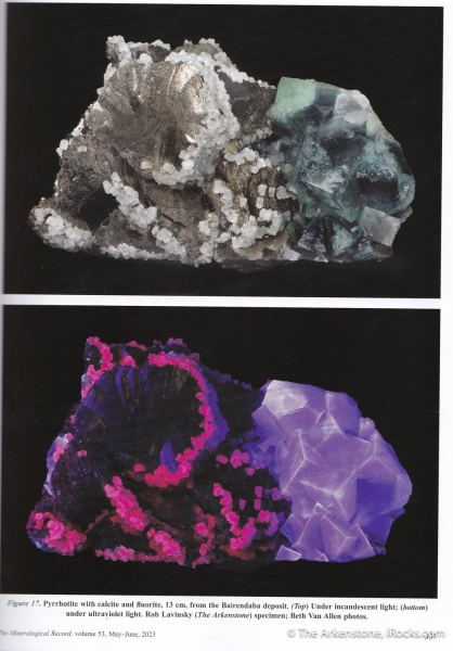 This is a Pyrrhotite and Fluorite with Calcite (Illustrated) from Bairendaba Mine, Hexigten Banner, Chifeng City, Inner Mongolia, China. China for some reason was not known for pyrrhotite, let alone world class examples that could rival those from Dalnegorsk in Russia, until now!Data last checked on 28th Jan 2026