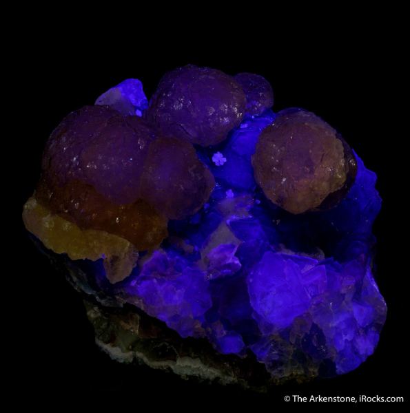 This is a Fluorite on Fluorite from Qingwan mine, Wujita village, Chenzhai town, Zhuji city, Shaoxing prefecture, Zhejiang province, China. A gorgeous multicolor Fluorite on Fluorite specimen showcased by translucent golden honey colored Fluorite with spectacular wet luster showing both the typical interconnected globular form and isolated well defined individual "balls." The largest individual yellow cluster measures 2.8 cm..Data last checked on 3rd Mar 2026 - specimen may no longer be available