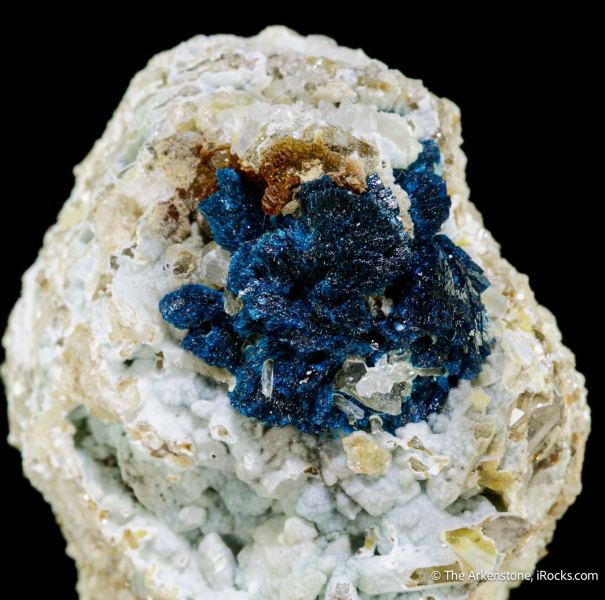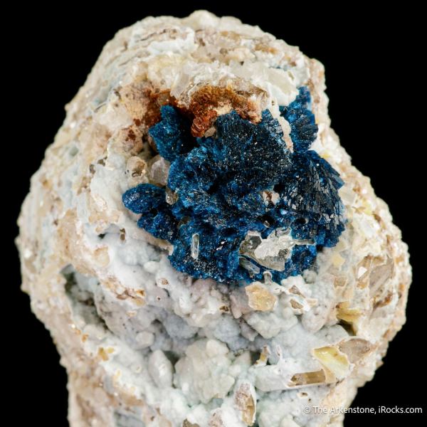 This is a Veszelyite on Hemimorphite from Sanguozhuang, Dongchuan District, Kunming, Yunnan, China. This rich specimen of the rare copper species formerly known just from old finds in Montana and a few other localities, is present here as a rich and solid rosette of crystals, in total about 1.75 cm across, nicely situated on contrasting matrix.Data last checked on 28th Jan 2026