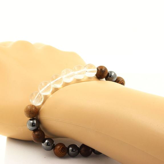 Quartz + Hematite + wood 8 mm beads Bracelet. (Ref: SKU050889)
