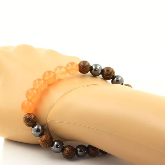 Orange Chalcedony + Hematite + wood 8 mm beads Bracelet. (Ref: SKU050912)