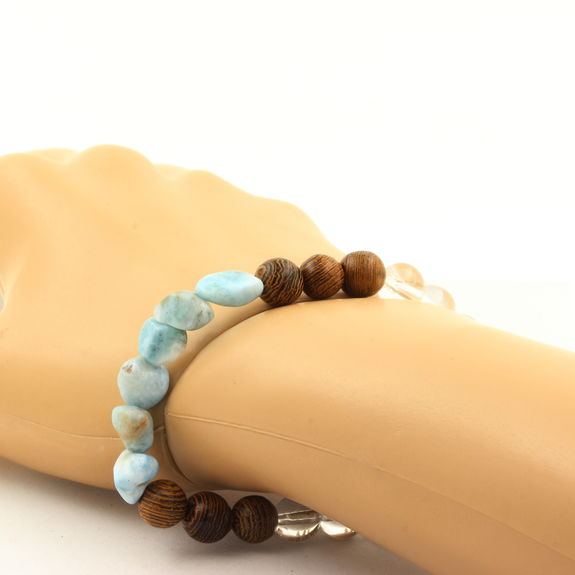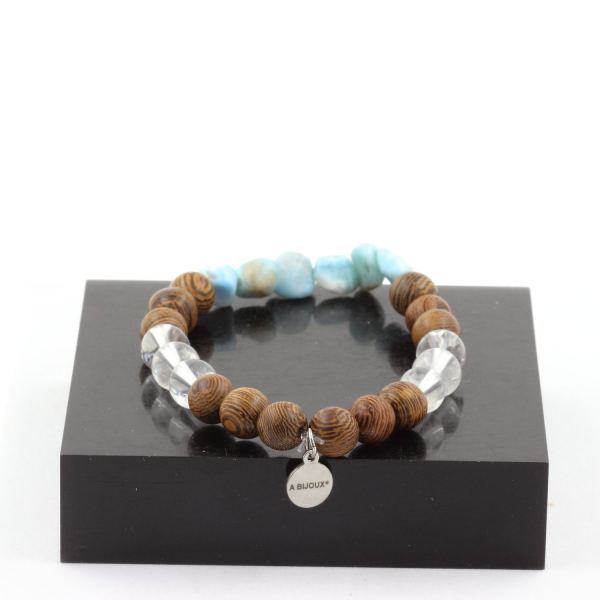 Larimar from Dominican Republic + Quartz + wood 8 mm beads Bracelet. Length 19-20 cm. Comes in a box pouch. We can make it to your length on request. Made in France in our A Bijoux workshop. Discover more than 1000 models of natural stone bracelets made by the A Bijoux brand with new products every day. Ref. : SKU050801Data last checked on 28th Jan 2026 - specimen may no longer be available