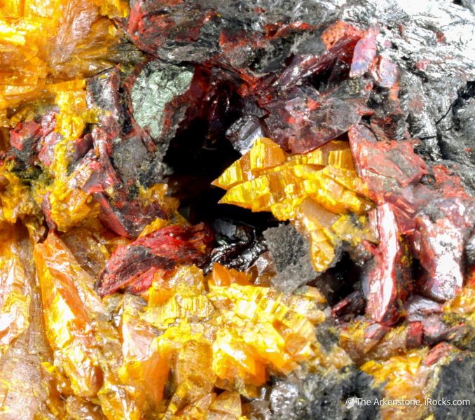 This is a Getchellite with Realgar and Orpiment (Type Locality) from Getchell Mine, Adam Peak, Humboldt County, Nevada, USA (Type Locality). This is a rare, colorful miniature of a trio of arsenic-bearing sulfides form the Getchell Mine in Nevada.Data last checked on 1st Feb 2026