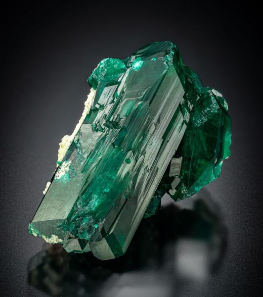 This is a Dioptase from Mfouati Mine, Mfouati Dist., Bouenza Dept., Republic of the Congo. A dramatic and lustrous, relatively large dioptase crystal that makes for an imposing thumbnail specimen.Data last checked on 16th Jan 2026 - specimen may no longer be available