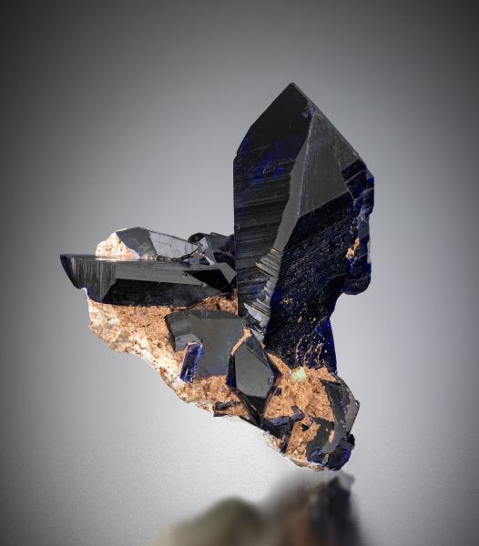 This is a Azurite from Milpillas Mine, Santa Cruz Mun., Sonora, Mexico. A very sharp, upright azurite crystal (of about 1 inch), perched elegantly on matrix.Data last checked on 5th Feb 2026 - specimen may no longer be available