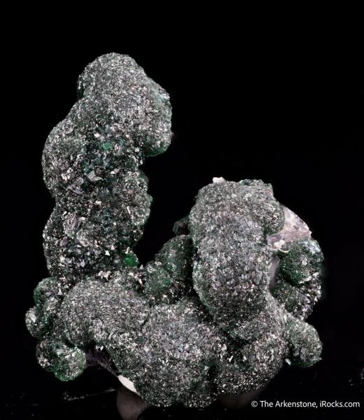 This is a Zincolivenite from Milpillas Mine, Santa Cruz Mun., Sonora, Mexico. Sculptural form consisting of sparkling interconnected spheres of dark forest green Zincolivenite botryoids with a transparent clear Calcite on one end.Data last checked on 13th Feb 2026 - specimen may no longer be available