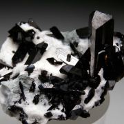 Benitoite, Neptunite, and Joaquinite crystals on schist matrix partially coated by white Natrolite. Good combination specimen of the 3 major species found at this now defunct mine.Data last checked on 10th Oct 2025