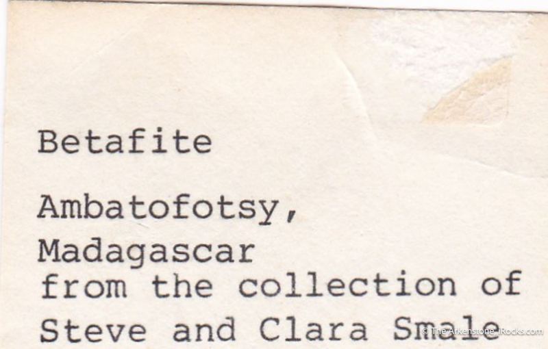 This is a Betafite from Ambatofotsy pegmatite, Mahavelona, Soavinandriana Dist., Itasy, Madagascar. Betafite is a strange and complex brew of uranium, titanium, and niobium, a member of the Pyrochlore Group of species.Data last checked on 27th Feb 2026