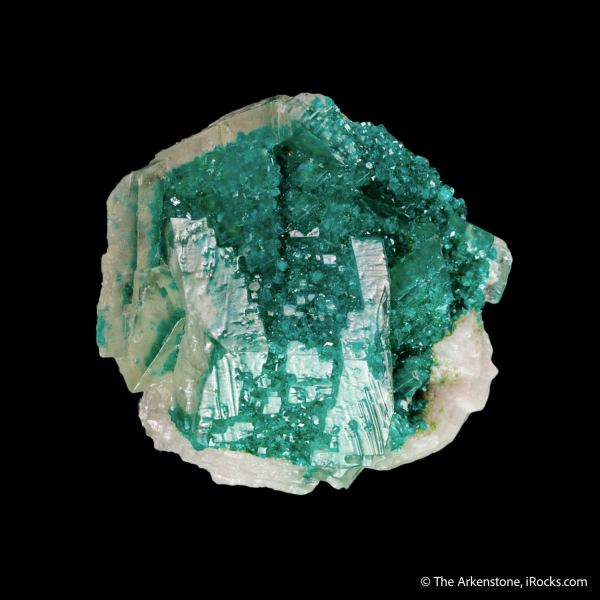 This is a Dioptase on and included in Calcite from Tsumeb Mine, Tsumeb, Oshikoto Region, Namibia. A very fine and colorful example of the intergrown dioptase and calcite combo, that is so desired from Tsumeb!Data last checked on 20th Jan 2026