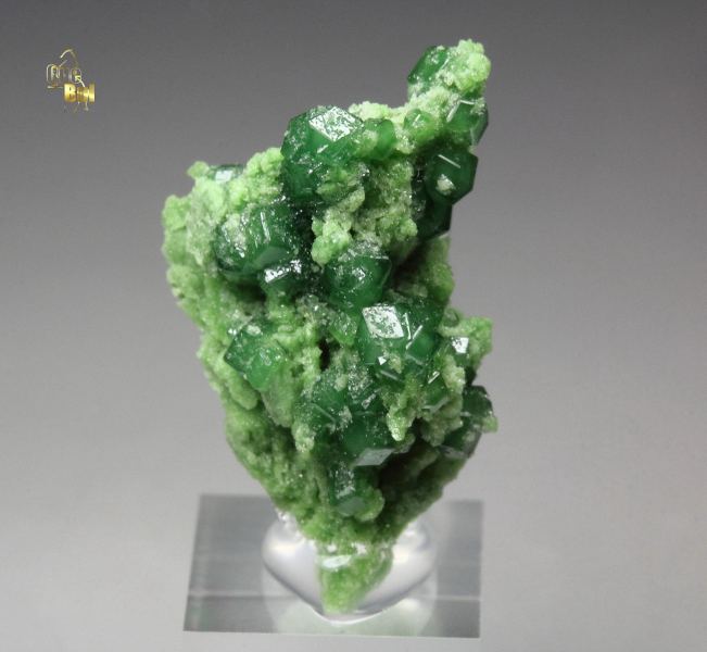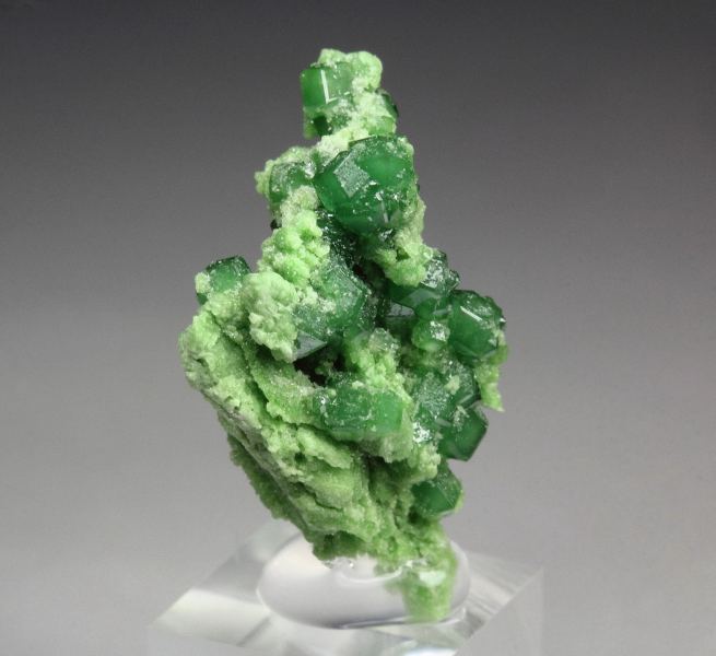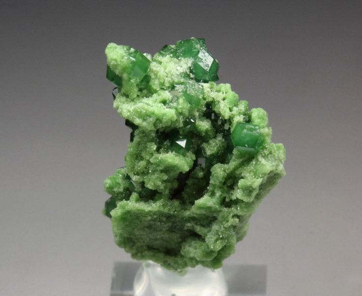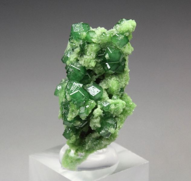A pleasing specimen of garnet var. grossular var. chromian crystals over diopside covered base from the famous Jeffrey mine, Quebec, Canada. The grossular crystals to 1mm have a green color result of chromium. They have a rhombic dodecahedral crystallization and good luster. They are translucent. Sparkling apple-green diopside covers the base. It displays all over 360 degree. For references see the 2013 issue of The Mineralogical Record vol. 44, # 4. In very good condition – some small contacts. On acrylic base., Marvelous!, Data last checked on 3rd Oct 2025 - specimen may no longer be available