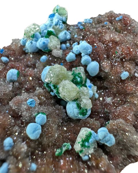 Great multi-mineral combo with relatively large crystals of willemite and blue plancheite spheres – "blue freckles", on sparkly quartz. Minor malachite. Willemite is strongly fluorescent.Data last checked on 1st Oct 2025 - specimen may no longer be available