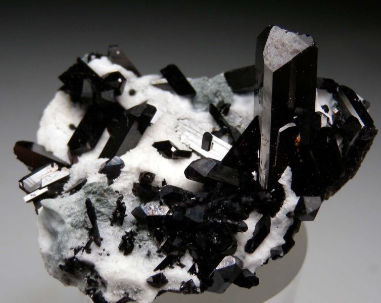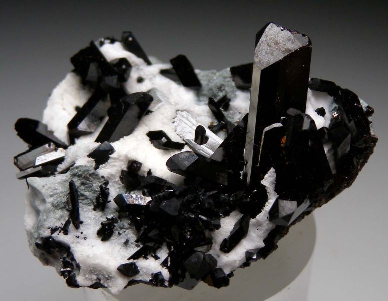 Glossy black Neptunite crystals on white Natrolite on a schist matrix. An aesthetic arrangment of crystals from the premiere locality for the species. The back of the termination of the main crystal is contacted but displays well from front. The rest of the crystals are in perfect condition.Data last checked on 10th Oct 2025