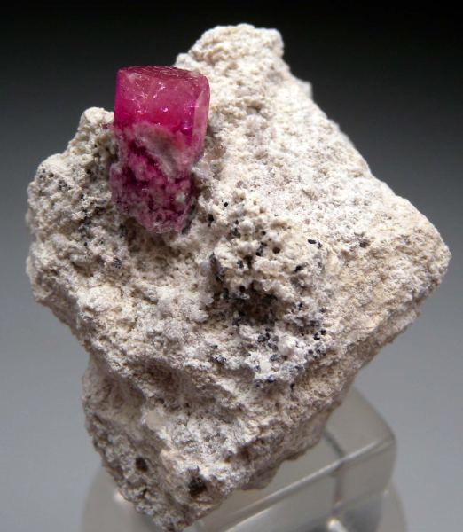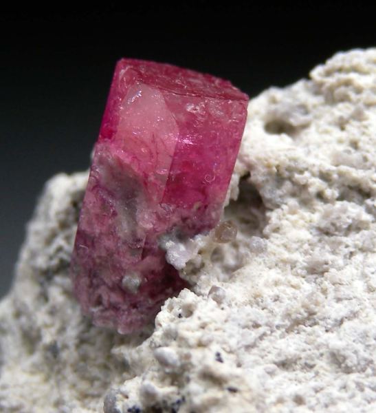 Glassy Red Beryl crystal on a Rhyolite matrix. The crystal forms a sharp hexagonal prism with a smooth, flat termination. The crystal is 10 x 5 mm and well formed. There is irregular growth or chipping along the termination edges - I think it's irregular growth as similar forms seen present on the front edge are also present along the back edge between the crystal and the matrix where no damage would be expected.Data last checked on 2nd Oct 2025 - specimen may no longer be available