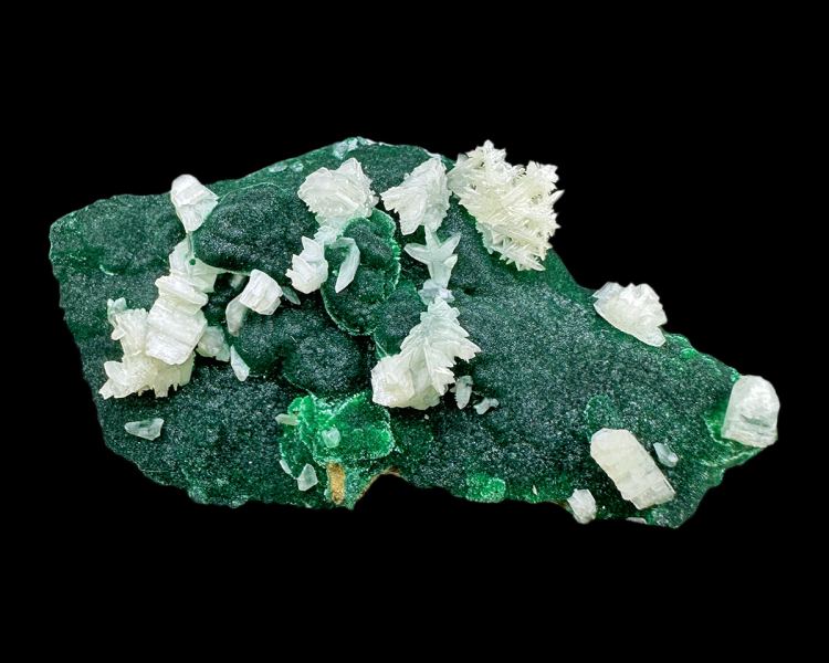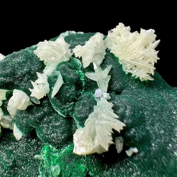 Pretty specimen of white cerussite "snowflakes" on contrastive green malachite.Data last checked on 3rd Oct 2025