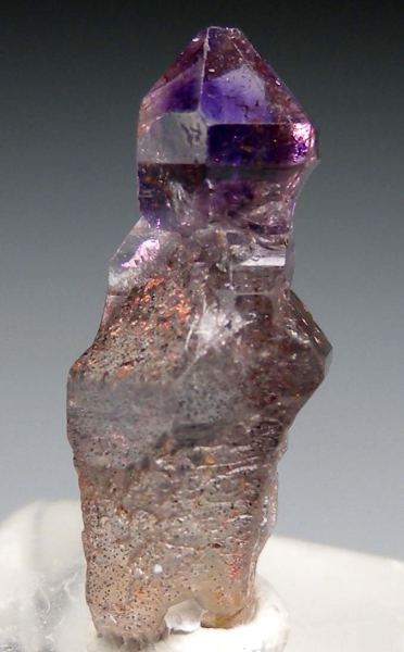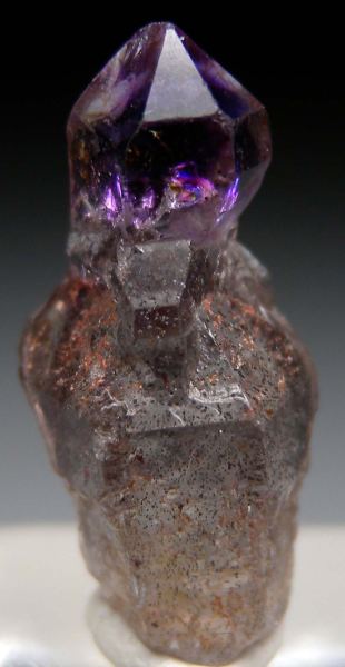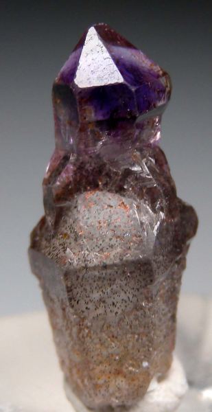 Colorless single Quartz crystal scepter with a secondary amethyst grown off the tip of the Quartz crystal. Complete all around and undamaged. Ex. Jon Sigerman collection acquired from the Si and Ann Frazier Quartz collection. This a glassy, lustrous crystal - don't be fooled by the camera that amplified tiny Hematite inclusions under the surface of the Quartz and makes it look somewhat dirty or non-lustrous. In hand all you notice is the glassy luster and amazing geometry.Data last checked on 8th Oct 2025 - specimen may no longer be available