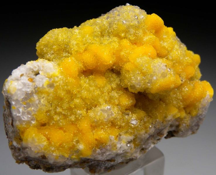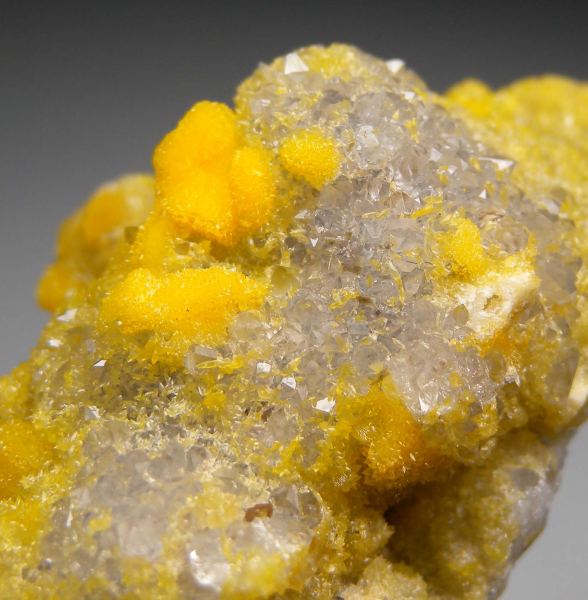 Vivid yellow cadmium rich Smithsonite across a matrix covered by glassy clear Quartz crystals.Data last checked on 10th Oct 2025