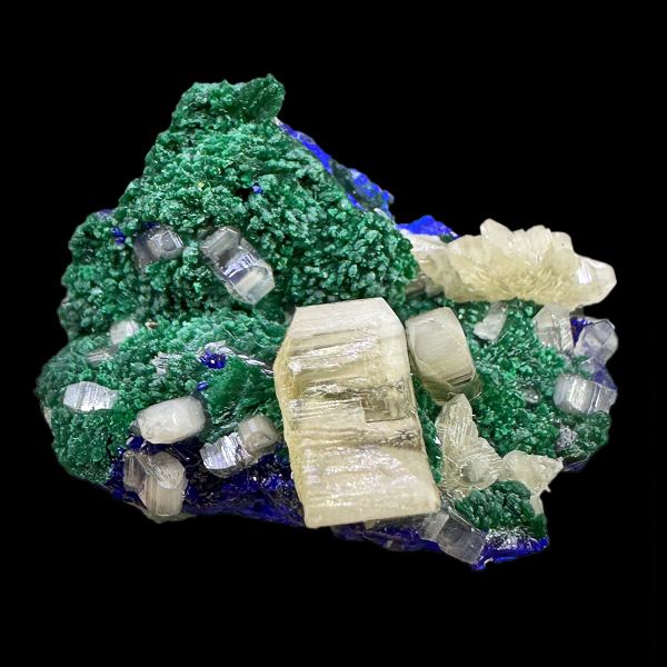 Pretty combo of lustrous cerussite crystals, green malachite and electric blue azurite. From 2024 find in Republic of the Congo.Data last checked on 11th Oct 2025 - specimen may no longer be available