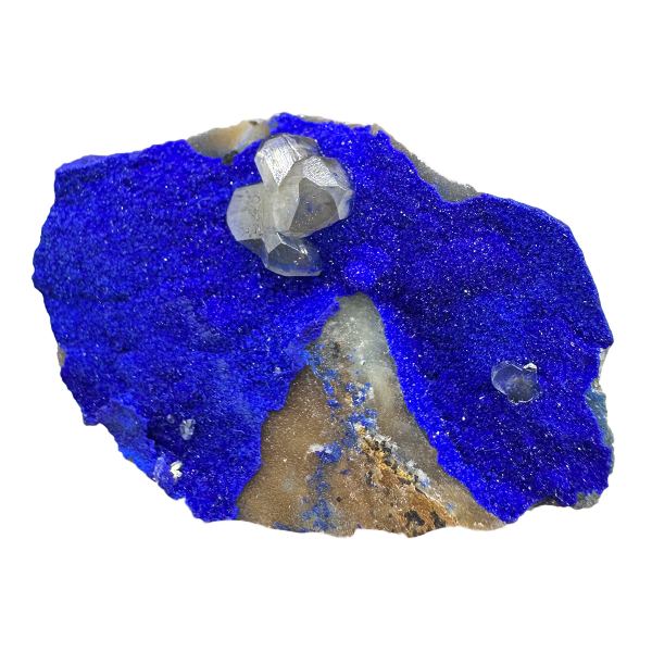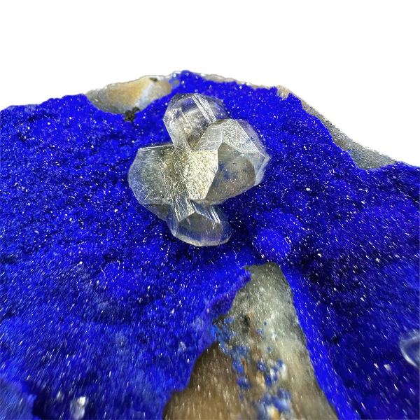 Top miniature of electric blue, sparkly azurite with lustrous, smoky cerussite twins, growing on smithsonite. From 2024 find in Republic of the Congo.;Data last checked on 15th Oct 2025