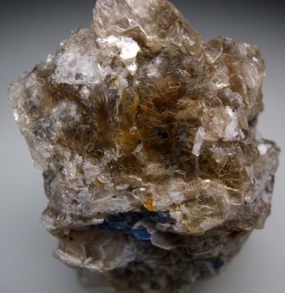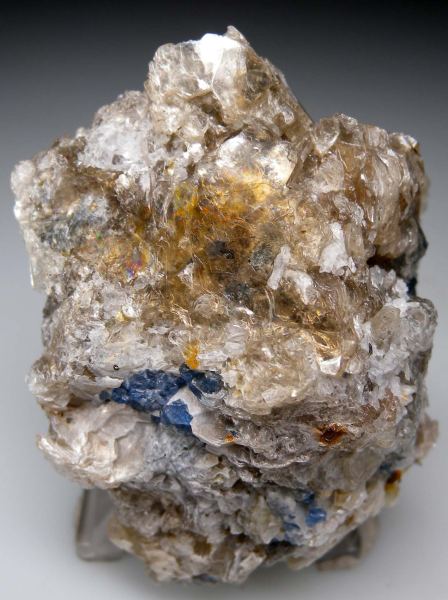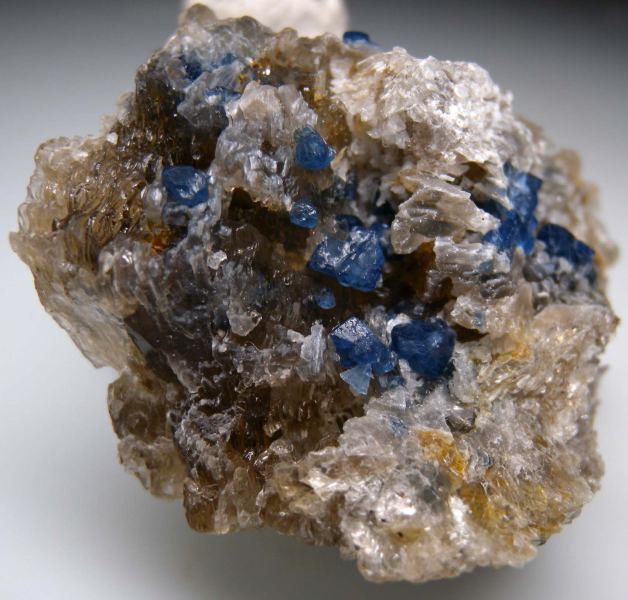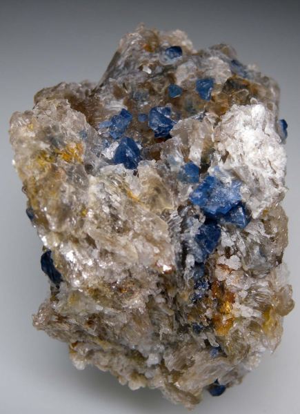 Blue Spinel crystals intergrown with golden transparent Phlogopite and a small amount of white Calcite. There are exposed Spinel crystals on various sides plus areas where you can see Spinel crystals grown inside the transparent ares of the Phlogopite.Data last checked on 20th Oct 2025