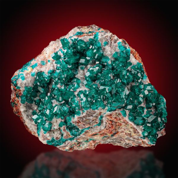 Sparkling, gem-like, and lustrous, rich emerald-green Dioptase crystals up to 0.7 cm in diameter cover the slightly curved matrix of this beautiful specimen from the Tsumeb mine. An outstanding example of fine, gem-like Dioptase crystals, abundantly scattered over the display face of glittering creamy Calcite. The sharp-edged Dioptase crystals have a beautiful, lustrous and nicely saturated emerald-green color that contrasts subtly with the light matrix. An outstanding specimen from the mine.Data last checked on 20th Oct 2025 - specimen may no longer be available