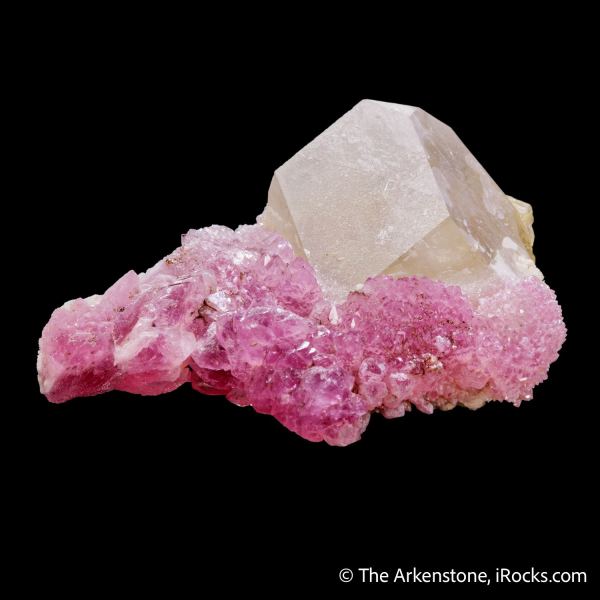 This is a Rose Quartz on Quartz from Taquaral, Itinga, Minas Gerais, Brazil. A stunning example of rose quartz with saturated, unusually strong color, forming a thick ribbon stretching up and away from a quartz point, if shown vertically.Data last checked on 24th Jan 2026 - specimen may no longer be available