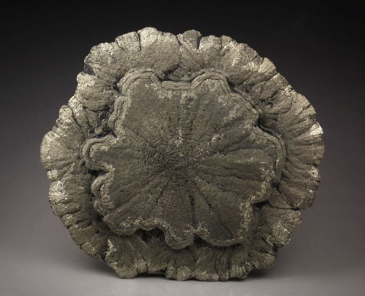 An impressive and fine specimen of so called “pyrite sun” forming neat flat radiating discus from Sparta, Illinois, USA. These beautiful pyrites form in shale. It is a complete all over floater. Pyrite is brassy, lustrous and sparkling to matt. It has pleasing yellow color. In excellent condition., Fascinating!, Data last checked on 8th Nov 2025 - specimen may no longer be available
