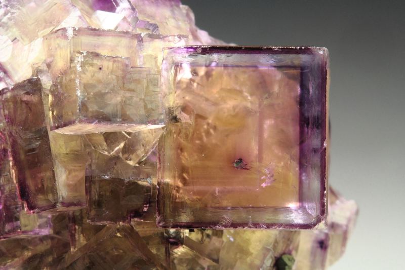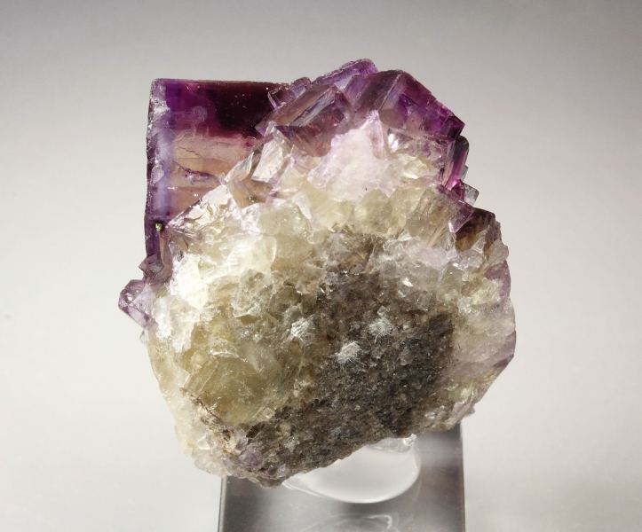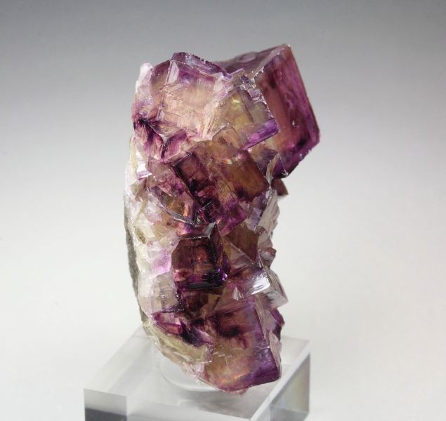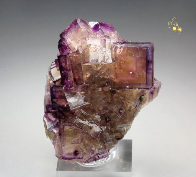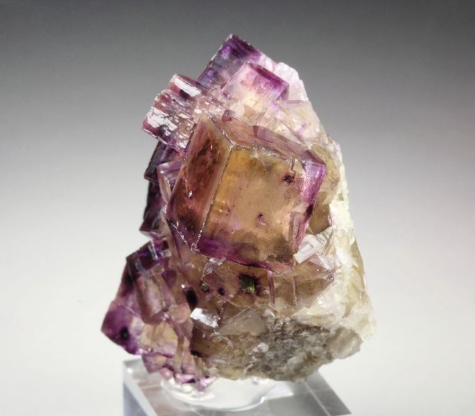 A gorgeous fluorite with colorful phantoms from this great and closed mine - Minerva No. 1 Mine, Cave-in-Rock, Illinois, United States. The crystals are glassy lustrous and light reflective. They have from rich cream cores to very saturated purple at the rims. The cubes are razor sharp and highly transparent. The real beauty in this specimen is the intense purple phantoms which have very sharp and geometrical cubic shape. The colors intensity is amazing. The fluorite has inclusions of small yellow chalcopyrite crystals. Interestingly around them the fluorite is purple which outlines them nicely. In very good condition – some small nicks. On acrylic base., Stunning!, Data last checked on 8th Nov 2025 - specimen may no longer be available