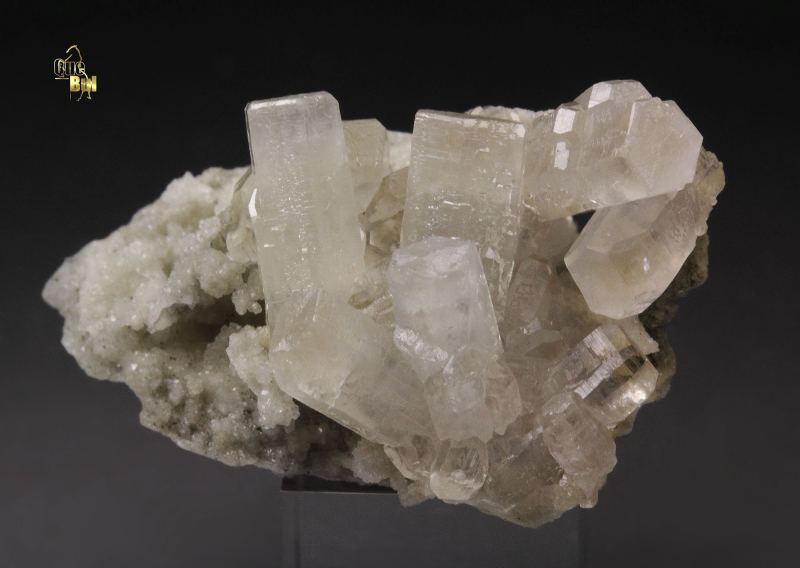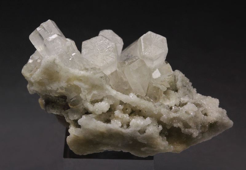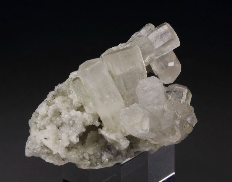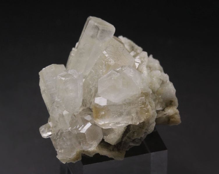 A fine specimen of strontianite from the famous classic European locality - Oberdorf an der Laming, Styria, Austria. This locality produced some of the best pieces of this strontium carbonate. It displays sharp hexagonal prismatic crystals to 10mm. They are colorless, partially transparent with good luster and face striations. They grow on a small base. In excelelnt condition. On acrylic base., Choice strontianite!Data last checked on 10th Nov 2025