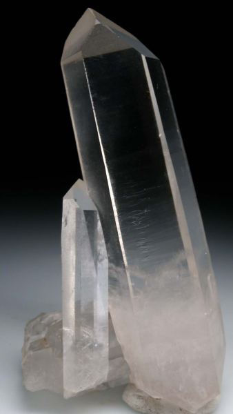 Large, water-clear Quartz crystal with a shorter crystal leaning into it and a few other crystals crossing at the base. There is some cloudiness in the base, but the upper 9cm is amazingly water-clear and perfect. Undamaged. Ex. Gene Reynolds, Cliff Krueger, Mike Keim collections.Data last checked on 11th Nov 2025 - specimen may no longer be available