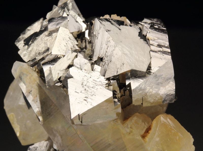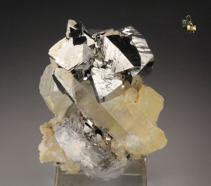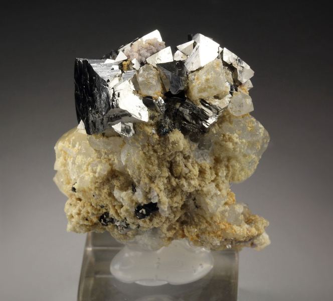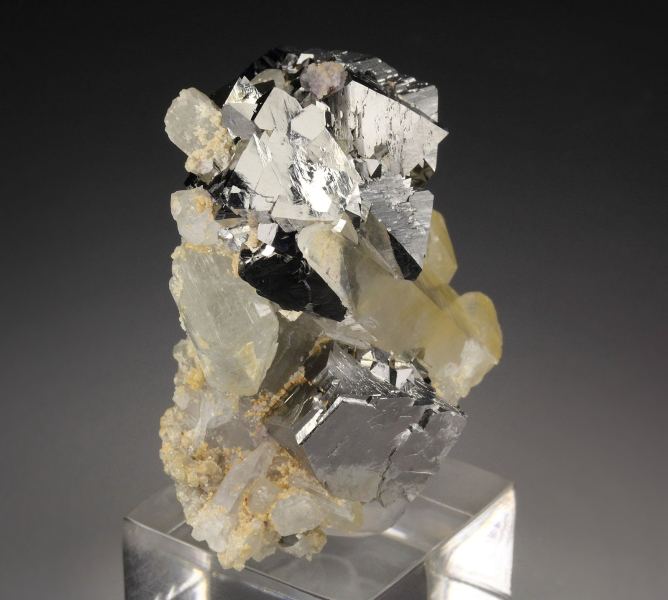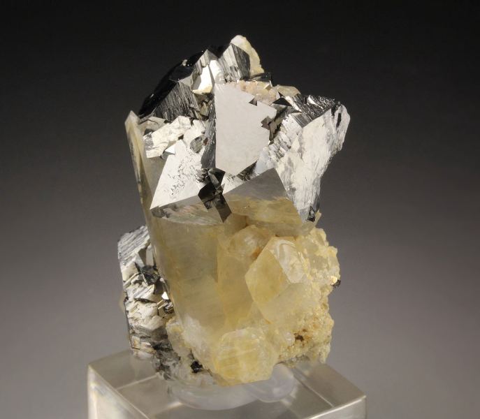 A beautiful specimen featuring superb arsenopyrite crystals with quartz from the famous Yaogangxian Mine, Hunan Province, China. The razor sharp octahedral arsenopyrite crystals to 28mm form an excellent focal point at the top. They are very well isolated with a high luster and brassy yellow color. The biggest crystal has a neat gap of 2mm in the crystal structure. One sharp and transparent quartz crystal grows in the middle. It is lustrous and slightly iridescent. Unidentified colorless crystals are seen too. In excellent condition. On acrylic base., Overwhelming!, Data last checked on 12th Nov 2025