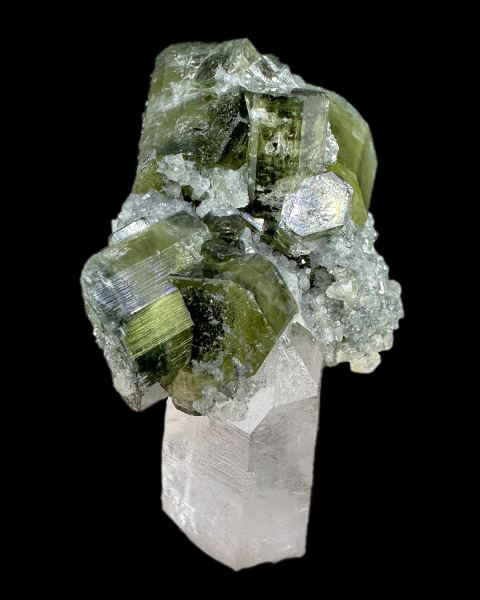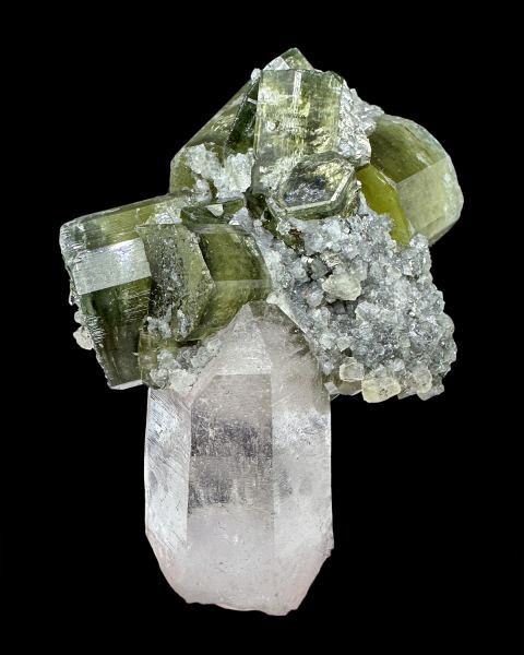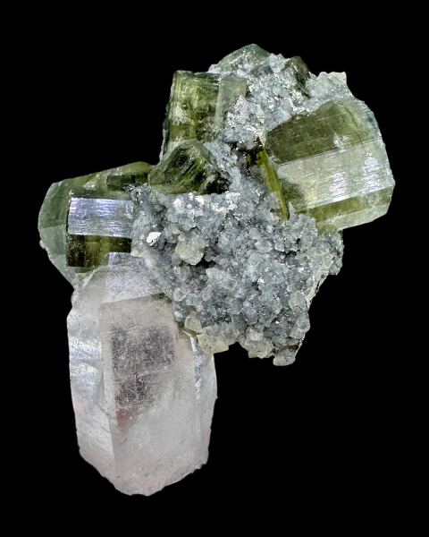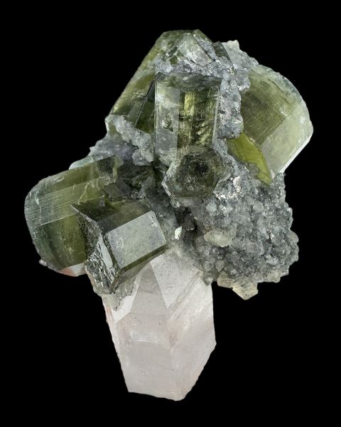 Cool combo of well formed, sharp and lustrous fluorapatite crystals with sparkly arsenopyrite and calcite, growing on top of the quartz. From famous Panasqueira mines in Portugal.Data last checked on 14th Nov 2025