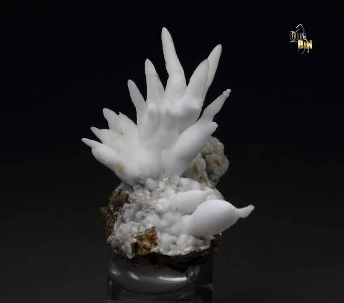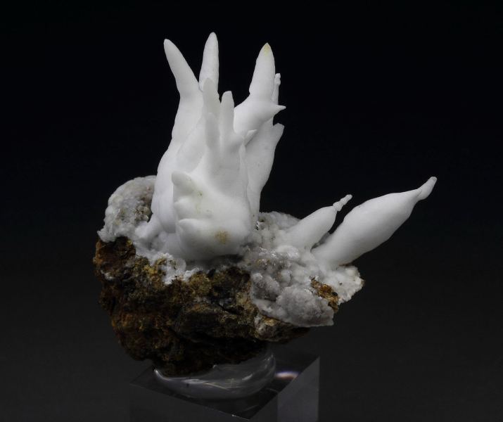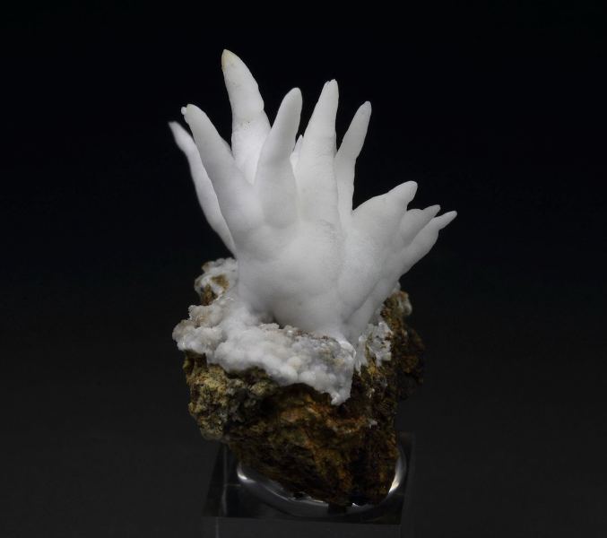 A beautiful specimen of aragonite var. flos ferri from the famous locality of Sainte-Marie-aux-Mines, Colmar-Ribeauville, France. The aragonite crystals are snow white. They form an attractive structure of elongated “stalactites”. Very sculptural and airy. The specimen is complete all over. In excellent condition. On acrylic base., Fabulous!, Data last checked on 14th Nov 2025