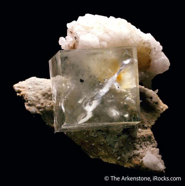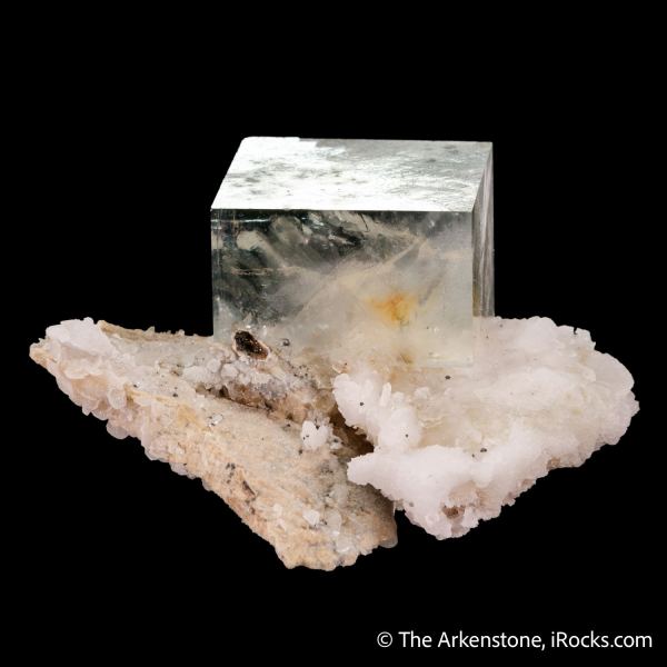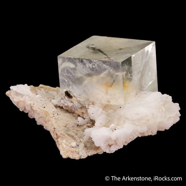 This is a Fluorite from Nikolaevskiy Mine, Dalnegorsk, Primorsky Krai, Russia. A single, transparent, pale pastel-green cube of fluorite is perfectly perched on a thin cluster of matrix shards associated with and cemented together by calcite on this classic Russian fluorite from the 1990s.Data last checked on 15th Nov 2025 - specimen may no longer be available