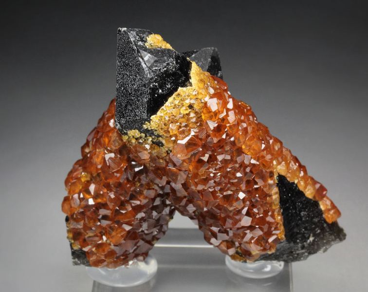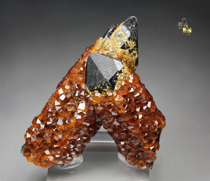 A stunning specimen displaying superb smoky quartz crystals sculpturally crossing each and decorated by gem spessartine garnets from Tongbei, Fujian Province, China. The Spessartine crystals are gem and bright with rich orange color. They have a sharp habit and strong glassy luster. They densely cover the quartzes. The smoky quartz crystals to 67mm are sharp, lustrous, with very dark smoky-black color. The stand is very aesthetic, sculptural and balanced on 360 degree with a strong contrast. In excellent condition – some minor nicks and base part contacts. On acrylic base., Astonishing world grade quality specimen!Data last checked on 18th Nov 2025 - specimen may no longer be available